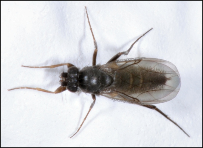 Adulto: mide de 2 a 3 mm. Destaca su tórax prominente o giboso, de ahí su nombre común de "mosca jorobada". Tiene el cuerpo marrón claro con la parte superior del abdomen oscura. Tiene un par de alas translucidas en las que destaca la venación de la parte anterior (venas radiales cortas, engrosadas y concentradas en su base anterior y con otras cuatro venas débiles corriendo paralelas en la membrana). Otra característica de esta especie es el gran desarrollo del fémur de la pata 3.